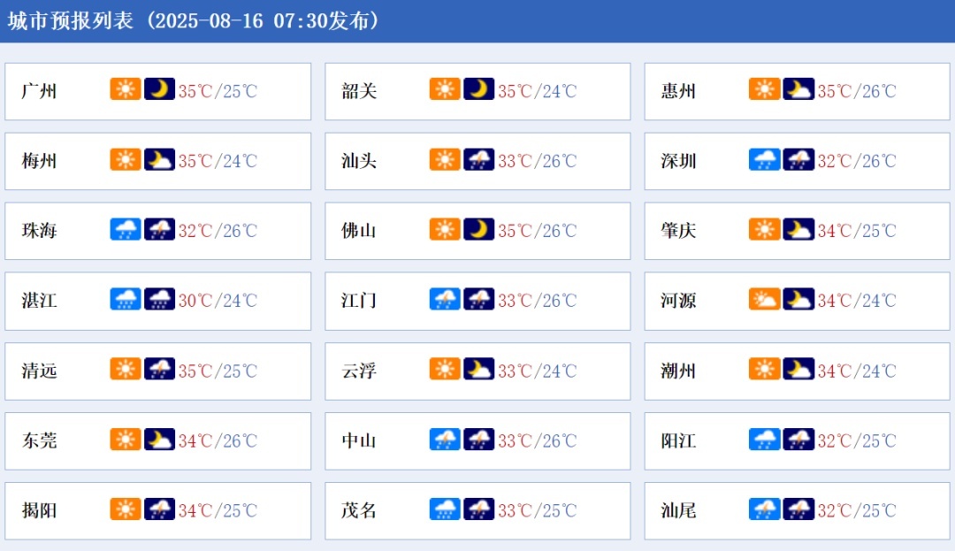 16日,雷州半岛有大雨到暴雨局部大暴雨,粤西沿海其余市县和珠江三角洲南部市县有(雷)阵雨局部暴雨,其余市县晴到多云,有分散(雷)阵雨。最高气温:粤西市县和其余南部沿海市县介于31~33℃,其余大部市县介于33~35℃。